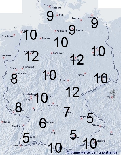 In Deutschland gehen teilweise wieder teils kräftige Regengüsse und Gewitter nieder. Sonst entsteht leichte Benetzung durch nächtlichen Strahlungstau. Die Benetzungsdauer liegt allgemein zwischen 7 und 12 Stunden. In der trockenen Gebieten im Süden bei 4 bis 6 Stunden.