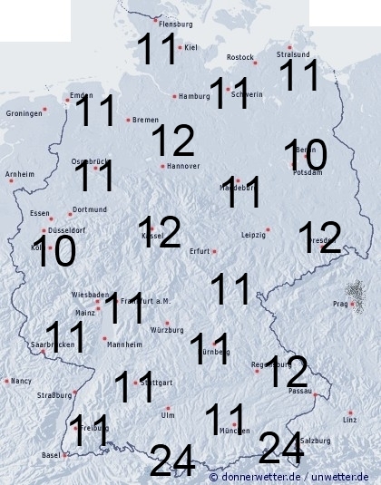 In Deutschland bleibt es meist freundlich und niederschlagsfrei. Benetzung entsteht durch nächtlichen Strahlungsreif. Die Benetzungsdauer liegt allgemein zwischen 9 und 13 Stunden, kann jedoch außerhalb von Ortschaften in geschützten Lagen noch nach oben abweichen. Bei einer vorhandenen Schneedecke werden bis zu 24 Stunden erreicht.