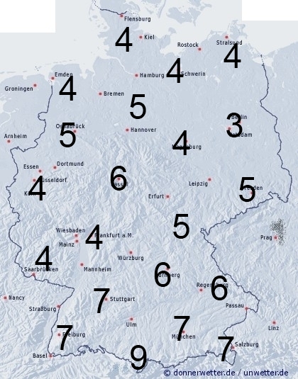 In Deutschland muss gebietsweise mit örtlichen Schauern und Gewittern gerechnet werden. Sonst entsteht leichte Benetzung durch nächtlichen Strahlungstau. Die Benetzungsdauer liegt allgemein zwischen 3 und 5 Stunden. Bei auftretenden Schauern können zwischen 5 und 9 Stunden erreicht werden.