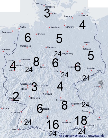 Die Benetzungsdauer liegt bei einer Schneedecke in den Bergen bei 24 Stunden. Sonst schwankt sie zwischen 2 Stunden in den niederschlagsfreien Zonen und bis 18 Stunden bei längerem Regen südlich der Donau.