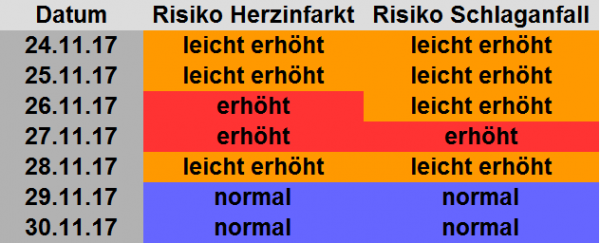In den letzten Novembertagen müssen Risikogruppen mit leicht erhöhten oder gar erhöhten Schlaganfall- und Herzinfarktrisiken rechnen.