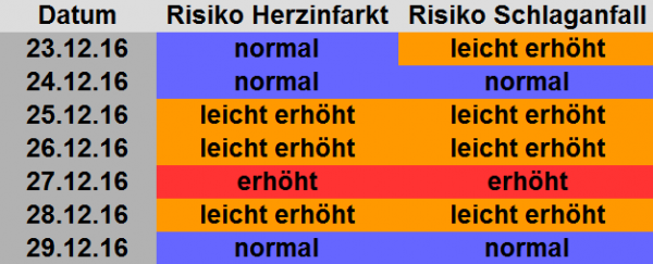 Weniger das Wetter als viel mehr die fettigen Festtagsspeisen könnten den Risikopatienten in diesem Jahr zum Verhängnis werden. Erst in der neuen Woche steigen die wetterbedingten Schlaganfall- und Herzinfarktrisiken wieder etwas an.