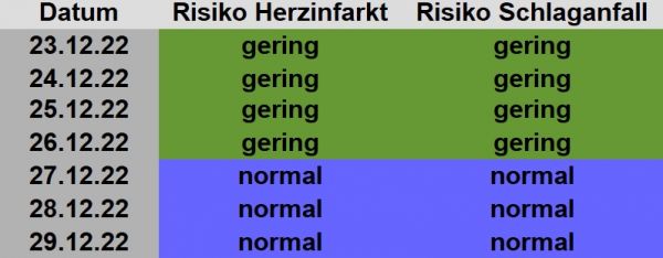Die Schlaganfall- und Herzinfarktrisiken bis zum 29.12.2022.