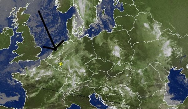 Zum Abschluss noch unser Satellitenbild von heute Morgen: Kaltluft im Anmarsch - schwarzer Pfeil