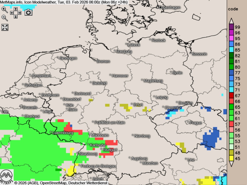Die Wetterkarten für 02:00, 04:00 und 06:00 Uhr nach ICON mit gefrierendem Regen (rot) im Westen und Südwesten