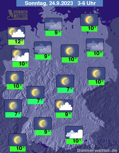 In der Nacht zum Sonntag halten sich im Südosten oft dichte Wolken. Im Norden sind hier und da auch noch einige Wolken unterwegs. Im übrigen Land ist es aber verbreitet nur gering bewölkt oder sternenklar. Es bleibt überall trocken bei Tiefstwerten von 12 Grad an der Nordsee und 7 Grad im Saargau.