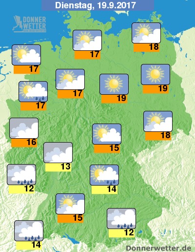 Am Dienstag ist es im Alpenvorland überwiegend bedeckt und es fällt hier teils langanhaltender und auch gewittriger Regen, auch im übrigen Süden ist es oft stark, teils aufgelockert bewölkt bei möglichen Schauern. Soonst ist es teils heiter bis sonnig, teils auch mal stärker bewölkt, aber zum Großteil trocken. Es werden 12 bis 19 Grad erreicht.