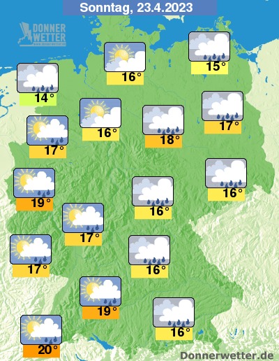 Heute zieht über dem Bundesgebiet wechselnde, oft jedoch auch dichte Bewölkung durch, dabei bilden sich gebietsweise Schauer. Gegen Abend entwickeln sich in den westlichen Landesteilen teilweise auch kräftige Schauer und vereinzelt sogar Gewitter. Die Temperatur steigt auf 14 Grad an der Nordsee und bis 20 Grad am Oberrhein.