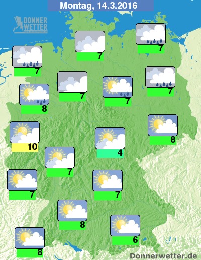 Am Montag ist es vor allem im Süden meist heiter, zum Teil sonnig und dazu trocken, im Norden ist es dagegen oft bedeckt und es fällt zeitweise Regen, in den übrigen Landesteilen bleibt es bei wechselnder Bewölkung trocken. Die Temperatur erreicht 4 bis 10 Grad.