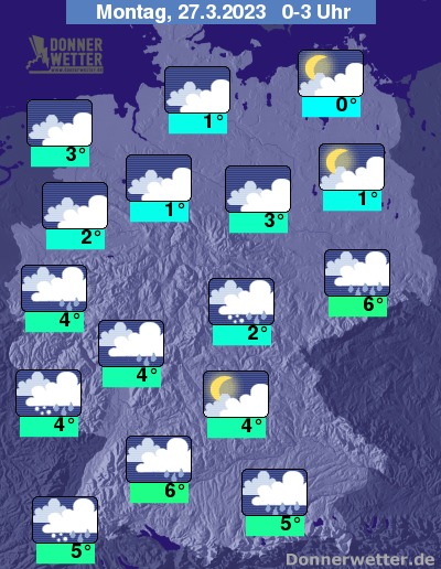 In der Nacht auf Montag lockern die Wolken über der Nord- und Westhälfte verbreitet auf und es bleibt zumeist trocken. Im Süden und Osten muss immer wieder mit Schauern gerechnet werden, die im Verlauf auch in Schneeregen oder Schnee übergehen können. Lokal besteht Glättegefahr durch überfrierende Nässe!