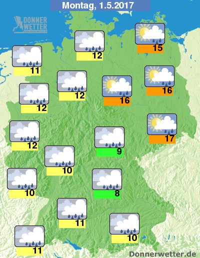 Zeitweiliger Sonnenschein ist zumindest am Vormittag noch im Nordosten zu erwarten, sonst dominieren jedoch eher dichte Wolken und dazu auch immer wieder Regenfälle. Die Temperaturen erreichen meist nur noch Werte zwischen 8 Grad in Niederbayern und bis 12 Grad im Rheinland. Im Osten und Nordosten wird es mit Werten bis 17 Grad deutlich wärmer.