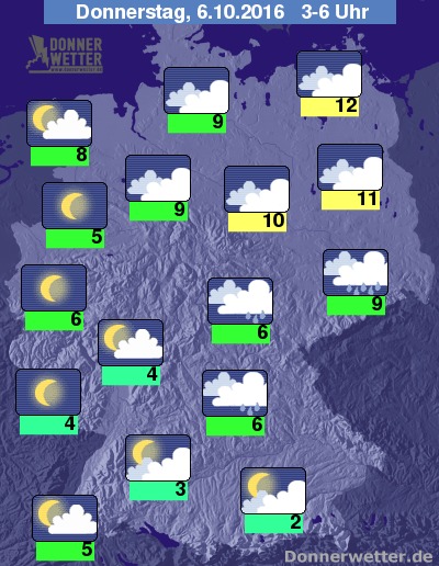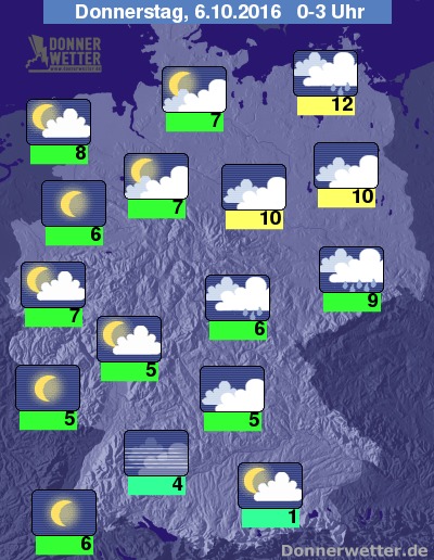 In der Nacht bleibt der Himmel im Nordosten weiterhin bedeckt. Im Westen ist der Himmel klar und nur locker bewölkt. Im Schwarzwald kann sich in den frühen Morgendstunden Nebel bilden. Es bleibt meist trocken, einzelne Schauer sind meist nur rund um das Erzgebirge und an der Ostseeküste möglich.