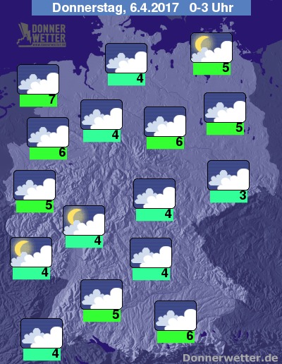 Die Nacht auf Donnerstag zeigt sich zunächst über der Bundesrepublik bedeckt und trocken. Regen ist nicht in Sicht. Die Temperaturen sinken in der Nacht auf Werte um 3 Grad C in der Sächischen Schweiz und 7 Grad C an der Nordseeküste.