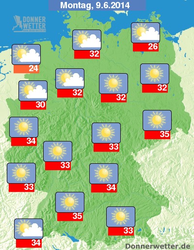 Der heutige Tag wird verbreitet heiß, dabei können sowohl der Osten als auch der Süden Temperaturen um 35, regional sogar bis 36 Grad erwarten.