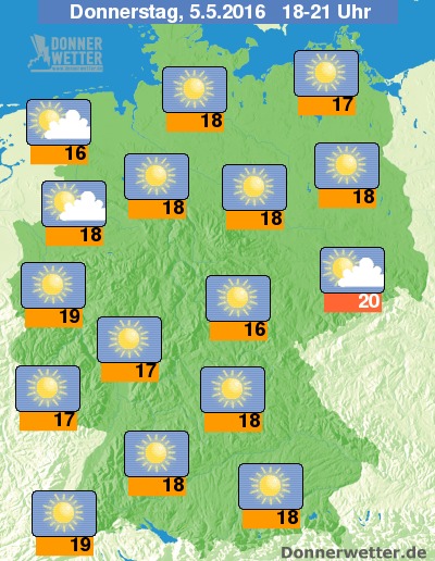 Am heutigen späten Nachmittag und Abend scheint über dem Bundesgebiet verbreitet die Sonne von einem größtenteils wolkenlosen Himmel. Ein paar meist lockere Wolken können über das östliche Sachsen hinwegziehen, und auch am Niederrhein und im Nordseeumfeld sind ein paar harmlose Wolken möglich. Es bleibt landesweit trocken bei Werten von 16 Grad am Thüringer Wald und etwa 20 Grad in Dresden.