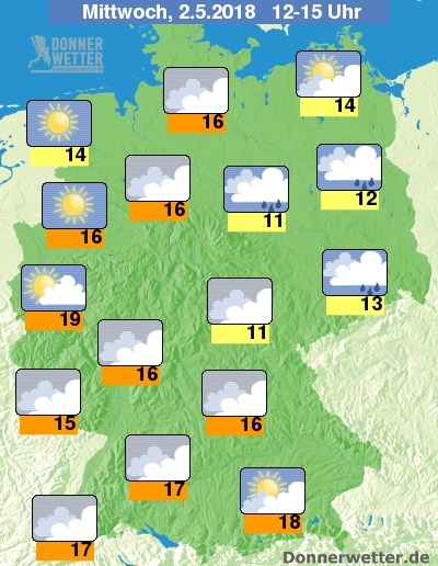 Heute Nachmittag fällt über Berlin-Brandenburg und Sachsen zeitweise Regen, auch sonst ist es im Land meist stark, nur hier und da auch aufgelockert bewölkt, jedoch trocken. Heiter oder sonnig und dabei trocken zeigt sich das Wetter entlang von Niederrhein und Ems bis zur Nordsee. Die Temperatur liegt bei 11 Grad im Thüringer Becken und etwa 19 Grad in Bonn.