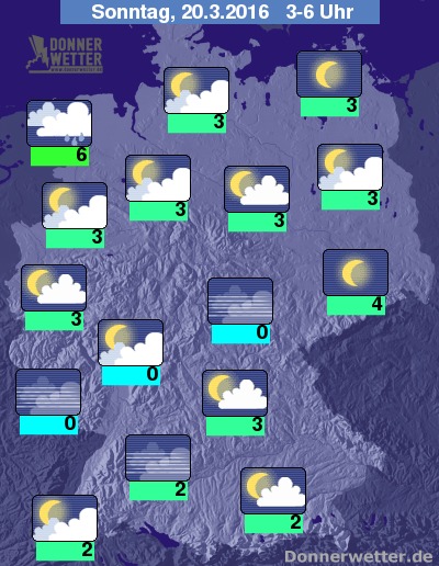 In der Nacht zum Sonntag ziehen im Nordwesten dichte Wolken und Regen oder Sprühregen auf, auch sonst ist es über der Nordhälfte Deutschlands oft stark, teils aber auch nur gering bewölkt, dabei bleibt es trocken. Über der Südhälfte der Republik ist es meist sternenklar, hier und da ziehen lockere Wolken durch, dazu bleibt es trocken. Die Temperatur sinkt auf 6 Grad an der Ems und bis Werte um 0 Grad am Odenwald.