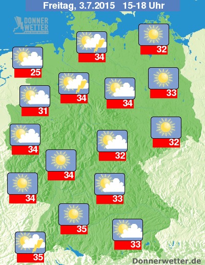 Heute Nachmittag zeigt sich Deutschland wiederum verbreitet sonnig, hier und da können aber auch einige Wolken durchziehen. Ein mäßiges Schauer- und Gewitterrisiko besteht dazu im Norden Deutschlands, hier sind regional auch schwere Gewitter möglich, auch rund um den Schwarzwald und am Alpenrand können vereinzelte Schauer und Gewitter auftreten, sonst bleibt es aber trocken. Die Temperatur steigt auf verhältnismäßig frische 25 Grad an der Nordsee und auf tropische 35 Grad im Breisgau.