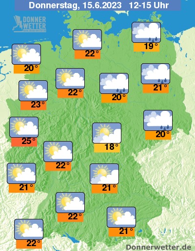 Heute Nachmittag ist es teilweise heiter, teils ziehen aber auch einige Quellwolken auf, dabei bleibt es weitgehend trocken. Dagegen ist es über dem Osten und Nordosten oft stark bewölkt und es bilden sich zudem lokale Schauer. Die Temperatur liegt bei 19 Grad in Stralsund und etwa 25 Grad in Bonn.