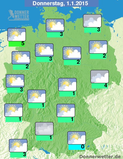 Am heutigen Neujahrstag kann sich vielerorts die Sonne blicken lassen, vor allem im Ostseeumfeld, im Osten sowie im Südosten Deutschlands bleibt es allerdings überwiegend bedeckt, dazu fällt hier aber kaum Regen, sonst bleibt es ohnehin trocken. Die Temperatur steigt auf 0 Grad am Alpenrand und bis 5 Grad an der Nordsee.