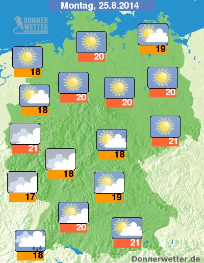 Heute scheint die Sonne vor allem in der Nordosthälfte Deutschlands von einem häufig wolkenfreiem Himmel. Besonders im Süden und Südwesten halten sich vielerorts auch dichte Wolken, dabei bleibt es aber zumeist trocken. In den übrigen Landesteilen ist es meist gering bis aufgelockert bewölkt und es bleibt trocken. Die Temperatur steigt auf 17 Grad am Pfälzer Wald und spätsommerliche 21 Grad in der Niederlausitz.