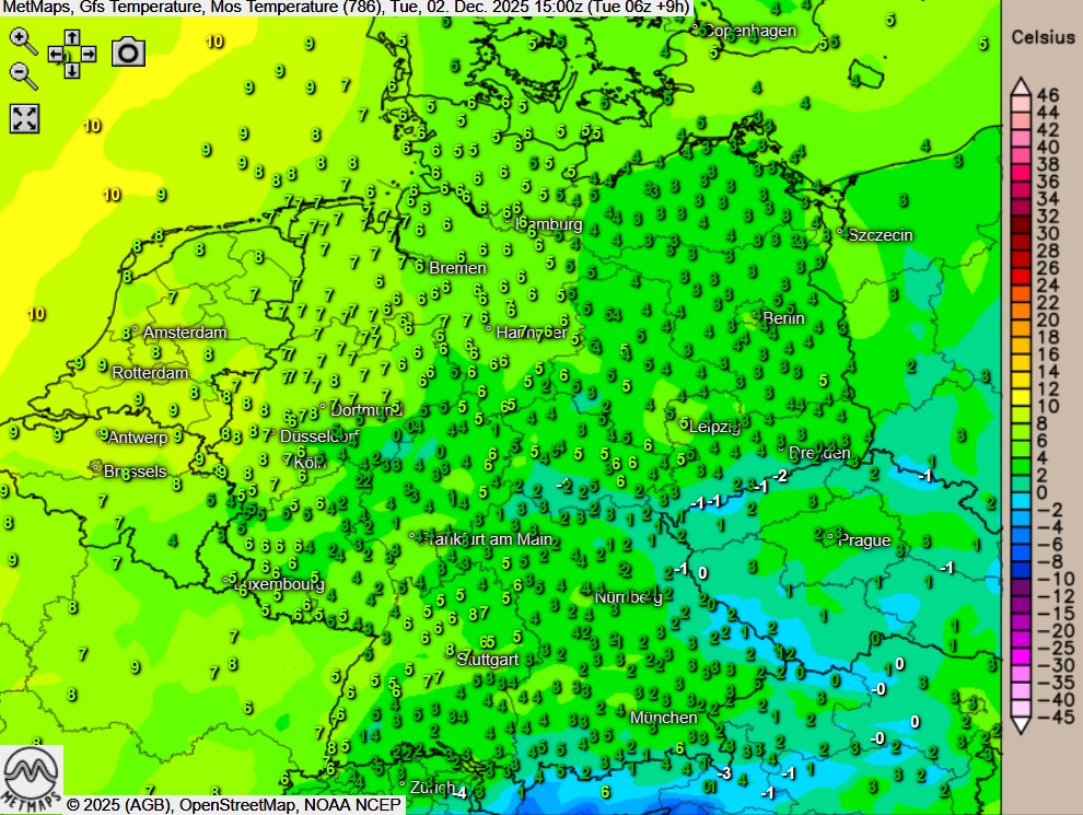 Die Temperaturen erreichen Höchstwerte um 4 bis 9 Grad.
