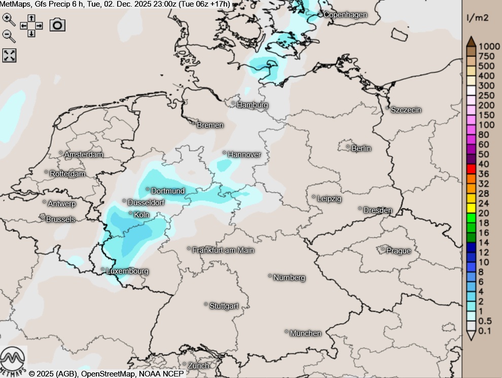 Die Temperatur- und Wetterkarte für Dienstagnachmittag (15:00 Uhr) sowie die Sechs-Stunden-Regenmengen bis 23:00 Uhr nach GFS: