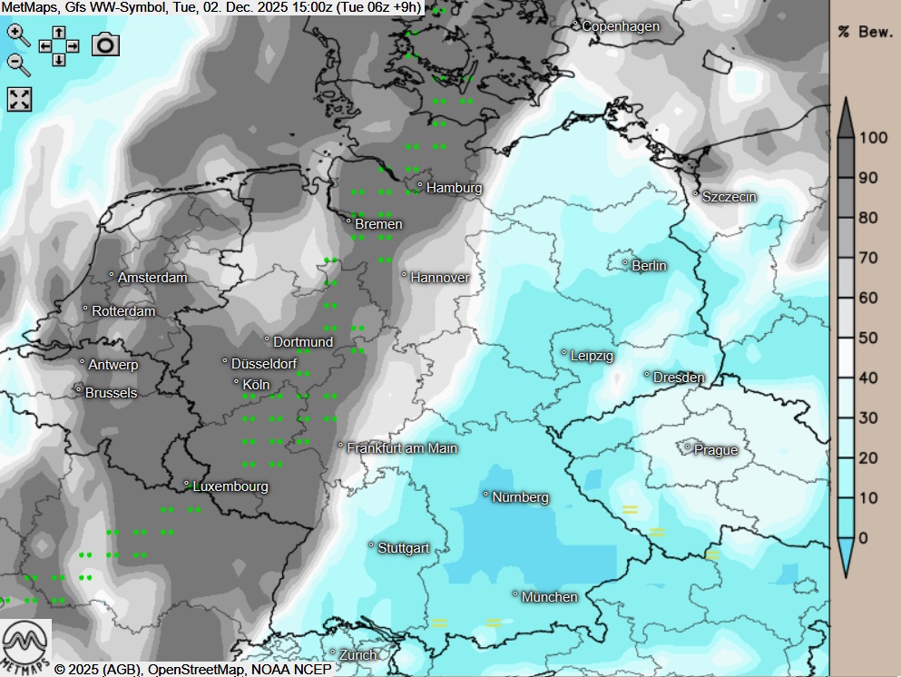 Am Dienstagnachmittag bleibt der Himmel über dem Westen und Nordwesten stark bewölkt, dabei fällt zeit- und gebietsweise etwas Regen oder Sprühregen. Im Süden und Südosten ist es am Nachmittag teils nebelig-trüb, vor allem in Alpennähe sowie im Osten auch heiter und es bleibt trocken.