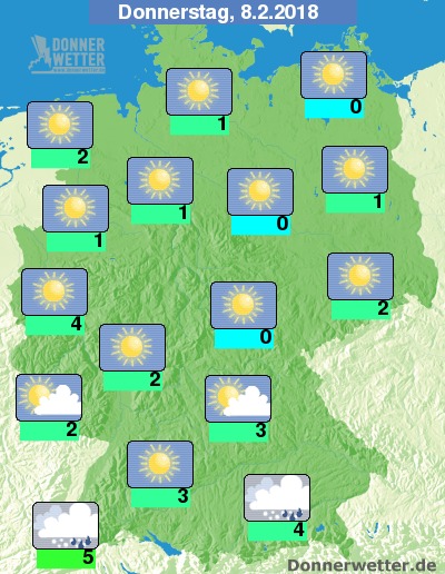 Ganz im Süden dominieren zunächst noch die Wolken und es kann noch etwas schneien. Sonst scheint recht häufig die Sonne. Gebietsweise können einige hohe und mittelhohe Wolkenfelder vorüberziehen. Nach frostiger Nacht erwärmt sich die Luft bis zum Nachmittag auf -2 bis 5 Grad. Der Wind weht dabei nur schwach bis mäßig.