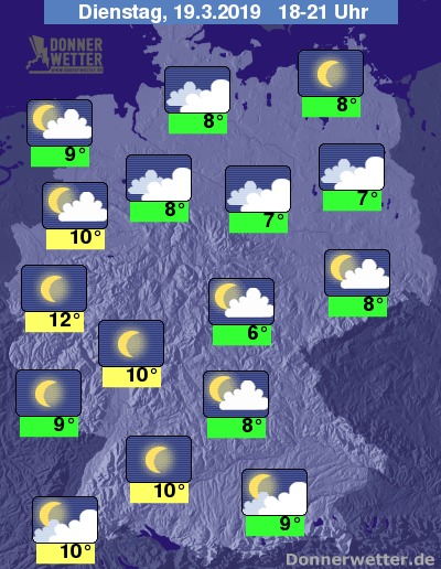 Die Temperaturen bewegen sich vor Dämmerungsbeginn noch bei 6 Grad im Thüringer Becken und 12 Grad im Westen.