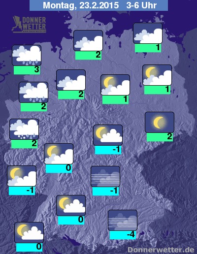 In der Nacht zum Montag ist es anfangs in der Südosthälfte Deutschlands noch oft sternenklar oder leicht bewölkt, sonst ziehen aber von Nordwesten her zunehmend dichte Wolken auf und bis zum Morgen fällt bereits bis etwa zu einer Linie von der Pfalz bis nach Rostock Regen, zum Teil ist auch Schneeregen oder Schnee möglich, dazu besteht erhöhte Glättegefahr. Südöstlich der Linie bleibt es bei oft aufgelockerter, teils schon starker Bewölkung noch trocken. Die Tiefstwerte erreichen 3 Grad in Ostfriesland und bis -4 Grad am Alpenrand. Im Norden und Westen weht dazu ein zunehmend starker und teils stürmischer Wind, auf den Bergen und an der See sind Sturmböen möglich.