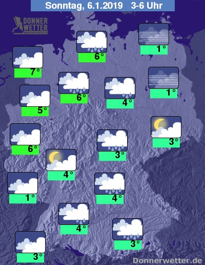 In der kommenden Nacht ist der Himmel verbreitet stark bewölkt, dabei bleibt es in den westlichen Landesteilen weitgehend trocken, während es sonst zeitweise regnet, an den Alpen fällt Schnee oder Schneeregen. Von Vorpommern bis Sachsen ist es oft sternenklar, hier bleibt es trocken. Die Temperatur sinkt auf 7 Grad an der Nordsee und bis 1 Grad an der Müritz.