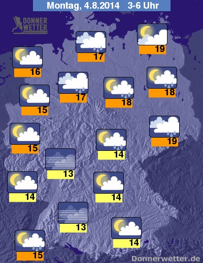 In der Nacht bilden sich vor allem in der Nordosthälfte des Landes unter meist dichten Wolken weitere Schauer und Gewitter, gebietsweise fällt zeitweiliger Regen, weiter nach Südwesten lockert die Bewölkung dagegen mehr und mehr auf und die Schauer und Gewitter klingen nach und nach ab. Die Temperatur sinkt auf 19 Grad in Leipzig und 13 Grad an der Schwäbischen Alb.