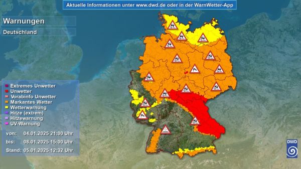 Aktuelle Warnungen am Nachmittag mit abklingender Schnee- und Eislage im Westen und Süden: