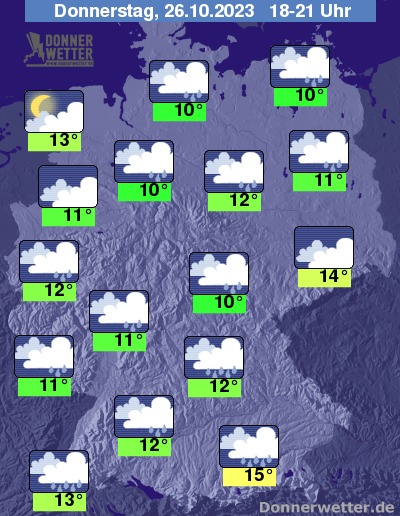 Heute Abend hält sich eine überwiegend dichte Bewölkung und es fällt besonders im Süden, aber auch im übrigen Land gebietsweise Regen. Die Temperatur liegt bei 10 Grad in Hamburg und rund 14 Grad in Dresden.