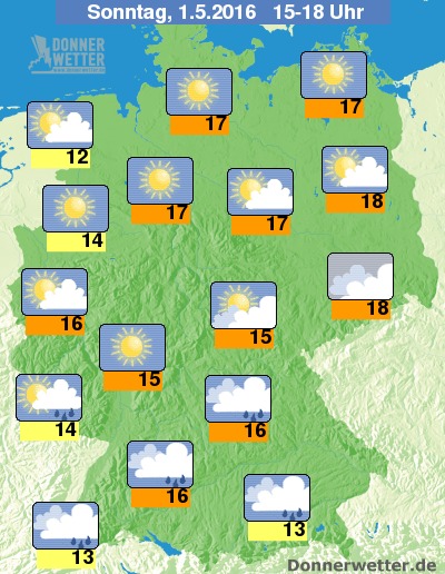 Heute Nachmittag bleibt es über dem Süden Deutschlands verbreitet bedeckt und es bilden sich wiederholt Schauer, selten auch Gewitter. Im Osten ist es oft stark, teils aufgelockert bewölkt, jedoch trocken. Im übrigen Bundesgebiet scheint häufig die Sonne bei nur lockeren Wolken oder es ist sonnig, dazu bleibt es ebenfalls trocken. Die Temperatur liegt bei 12 Grad in Leer und um 18 Grad in Berlin.