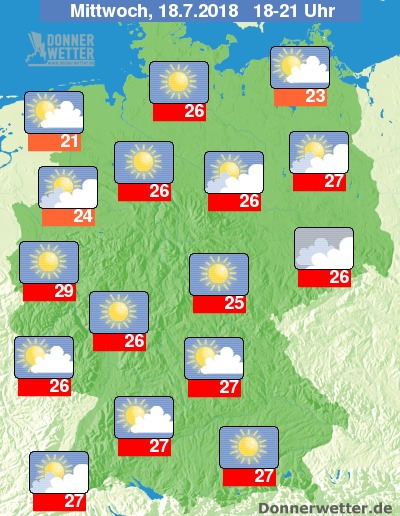 Heute Abend ist es zum Großteil heiter bis sonnig, lediglich vom Osten bis in den Nordosten halten sich oft auch dichte Wolken, teils ist es hier aber auch aufgelockert bewölkt, dazu bleibt es landesweit trocken. Die Temperatur liegt bei 21 Grad in Cuxhaven und bis 29 Grad in Köln.