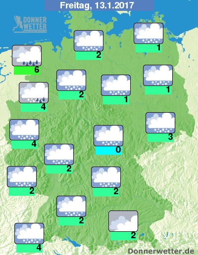 Am Freitag halten die Schneefälle weiter an. Nur in Nordseenähe fällt Regen. Die Sonne zeigt sich höchstens in kurzen Unterbrechungen. Zudem bleibt es landesweit stürmisch. Die Höchstwerte liegen zwischen 0 und 6 Grad.