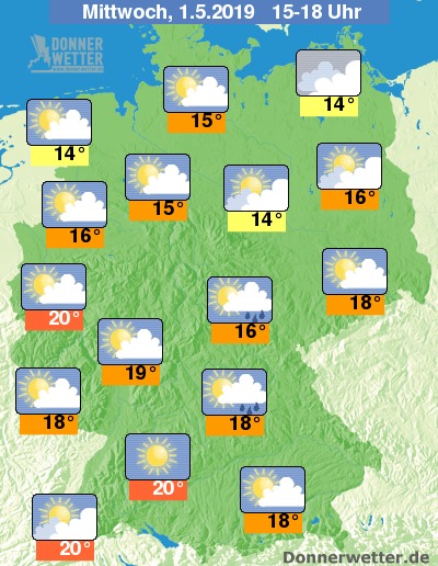Die Temperaturen steigen im Laufe des Nachmittags auf 14 bis 19 Grad, im Südwesten und Westen können örtlich auch 20 Grad erreicht oder etwas überschritten werden.