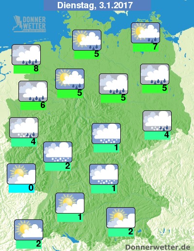 Heute ziehen überwiegend dichte Wolken über Deutschland hinweg, dabei fällt auch gebietsweise Regen, Schneeregen oder Schnee. Örtlich besteht Glättegefahr! Besonders im Süden scheint jedoch oft die Sonne bei hier meist lockeren Wolken. Die Temperatur steigt auf 0 Grad am Pfälzer Wald und bis auf 8 Grad im nördlichen Emsland.