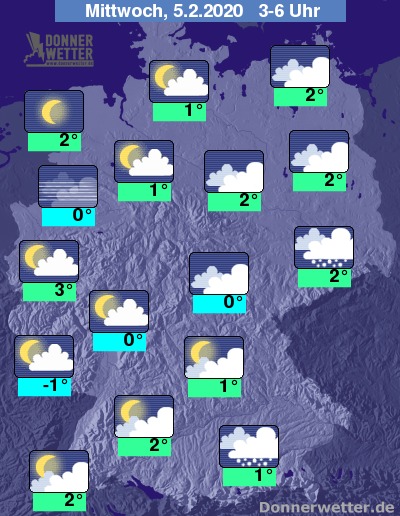 In der zweiten Nachthälfte fällt im Osten und im Alpenvorland noch Schnee bis in tiefere Lagen. Im übrigen Land bleibt es wechselnd wolkig. Im Nordwesten kann man Mond und Sterne auch für längere Zeit beobachten. Im Münsterland bildet sich stellenweise Nebel.