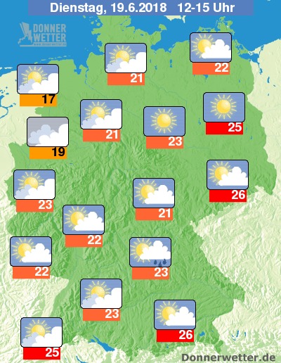 Heute Nachmittag ist es überwiegend heiter bis wechselnd bewölkt. Über dem Nordwesten ist es jedoch meist stark, teils auch aufgelockert bewölkt, hier bilden sich gebietsweise Schauer. Einzelne Schauer sind auch über Bayern möglich, sonst bleibt es aber weitgehend trocken. Die Temperatur liegt bei 17 Grad an der Nordsee und 26 Grad in der Lausitz.