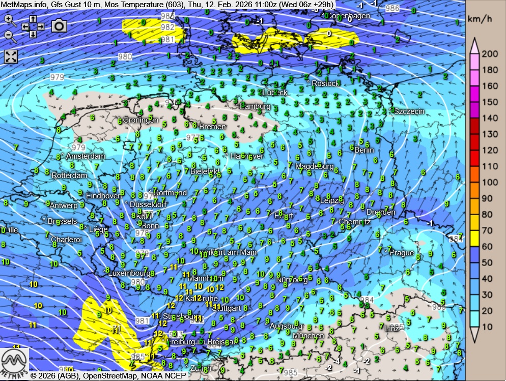 Die Wetterkarte für 06:00 Uhr, die Böen- / Temperaturkarte für 11:00 Uhr sowie die 24-Stunden-Regenmengen für Donnerstag nach GFS: