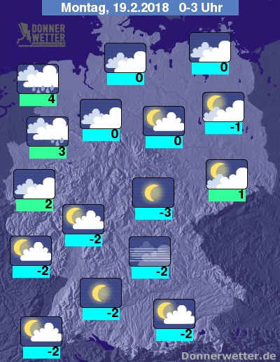 Grau und nasskalt startet die neue Arbeitswoche dann vor allem in der Nordwesthälfte. Regional muss mit Glätte und Beeinträchtigungen im Berufsverkehr gerechnet werden. Freundlicher startet am Montagmorgen der Süden in den Tag, hier bleibt es bei wechselnder Bewölkung meist trocken.