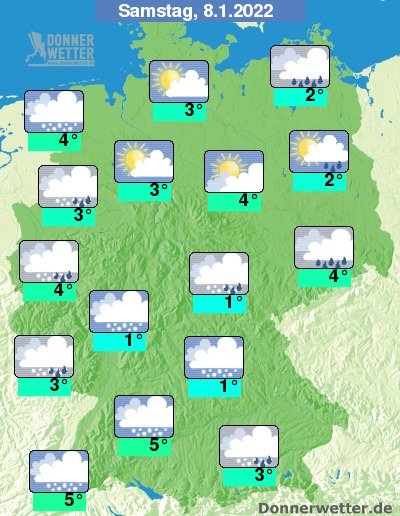 Am Samstag ist es meist stark oder dicht bewölkt, vorübergehende Auflockerungen sind jedoch möglich. Im Tagesverlauf zieht von Westen neuer Schnee auf, der im weiteren Verlauf oft in Regen übergeht. Nach Osten hin bleibt es zumeist trocken. Die Temperatur steigt auf 1 Grad in Nürnberg und bis 5 Grad in Freiburg. An den Küsten ist es häufig stürmisch.