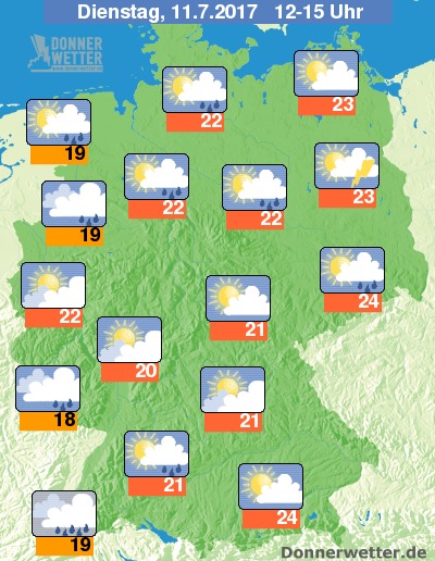 Heute Nachmittag ist es über dem Land aufgelockert oder stark bewölkt, dabei bleibt es über der breiten Landesmitte und im Südosten der Republik meist trocken, sonst bilden sich hingegen gebietsweise Schauer und auch einzelne Gewitter. Die Temperatur liegt bei 18 Grad am Pfälzer Wald und etwa 24 Grad in München.
