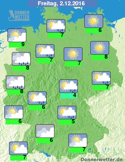 Der Freitag beginnt vor allem im Nordosten des Landes mit strahlendem Sonnenschein. Auch im Süden bleibt es meist trocken. Mit Regen ist hingegen vor allem in der Mitte des Landes zu rechnen, im Westen kommt die Sonne mancherorts bis zum Abend nicht zum Vorschein. Die Höchstwerte erreichen 4 Grad im Thüringer Bergland und milde 9 Grad an der Nordsee.