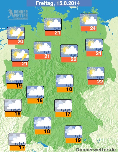 Am Freitag startet im Norden und Osten noch meist aufgelockert bewölkt und trocken, sonst ziehen auch schon häufig dichte Wolken übers Land und bringen zeitweise Regen oder einzelne Schauer. Am Nachmittag können sich dann, mit Ausnahme des Ostseeumfeldes fast überall Schauer und Gewitter entwickeln. Die Temperatur steigt auf kühle 16 Grad am Pfälzer Wald und immerhin 24 Grad an der Müritz.