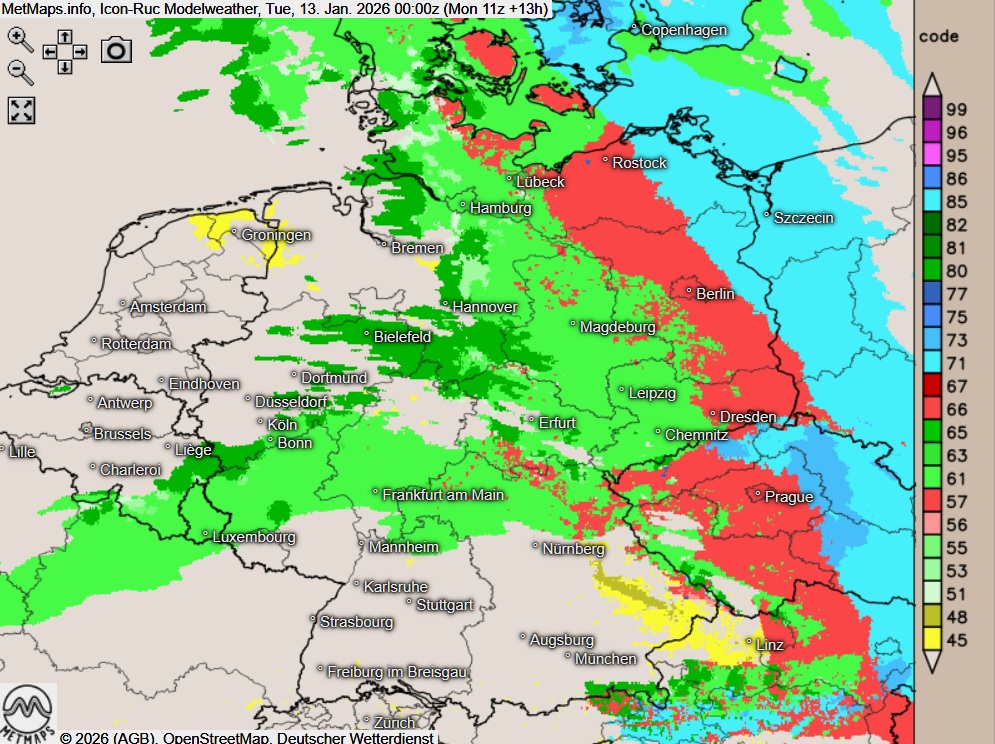 Die Modellkarten nach ICON für 00:00, 03:00 und 06:00 Uhr mit den Eisregenbereichen in rot, Schneefall in blau, Regen in grün:
