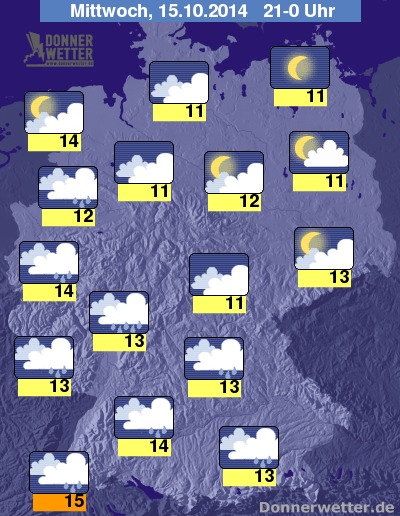 In der Nacht zum Donnerstag breiten sich die dichten Regenwolken noch weiter nach Nordosten hin aus, sie erreichen bis zum Morgen etwa einen Streifen von Niedersachsen bis nach Sachsen, nordöstlich davon bleibt es meist aufgelockert oder nur locker bewölkt und trocken, jedoch kann sich örtlich Nebel oder Dunst bilden. Im Südwesten des Landes klingt der Regen in der zweiten Nachthälfte nach und nach ab und die Bewölkung lockert gegen Morgen verbreitet auf, dann ist hier ebenfalls regional mit Nebel oder Dunst zu rechnen. Die Temperatur sinkt auf 12 Grad an der Nordseeküste und bei Aufklaren bis 8 Grad an der Müritz.